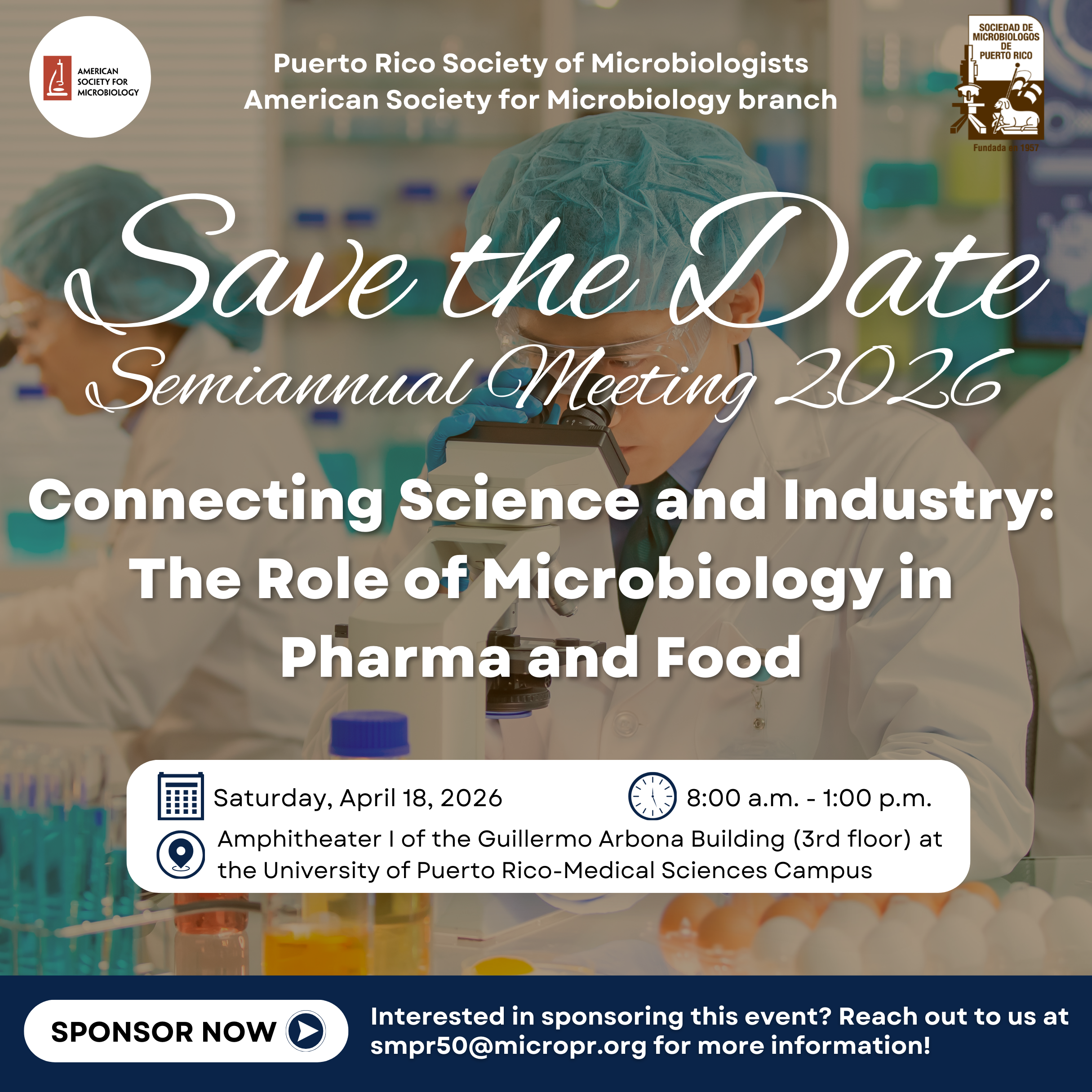 We are pleased to announce our half-day event Connecting Science and Industry: The Role of Microbiology in Pharma and Food, which will take place on Saturday, April 18, 2026, at the amphitheater I of the University of Puerto Rico-Medical Sciences Campus at San Juan, Puerto Rico from 8:00 a.m. to 1:00 p.m. This event aims to connect science with industry, highlighting the fundamental role of microbiology in the pharmaceutical and food sectors, as well as fostering dialogue among academia, industry, and future professionals in the field.
